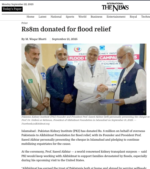 The Pakistan Kidney Institute (PKI) has contributed Rs. 8 million, on behalf of overseas Pakistanis, to the Alkhidmat Foundation in support of ongoing flood relief efforts.
